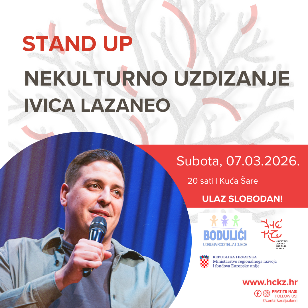 U subotu, 7. ožujka 2026. u 20 sati u Kući Šare gostuje splitksi stand up komičar Ivica Lazaneo s predstavom „Nekulturno uzdizanje“. Kroz britak i iskren humor Lazaneo govori o svakodnevnim situacijama, međuljudskim odnosima i društvenim apsurdima, donoseći publici večer kvalitetne zabave i smijeha.